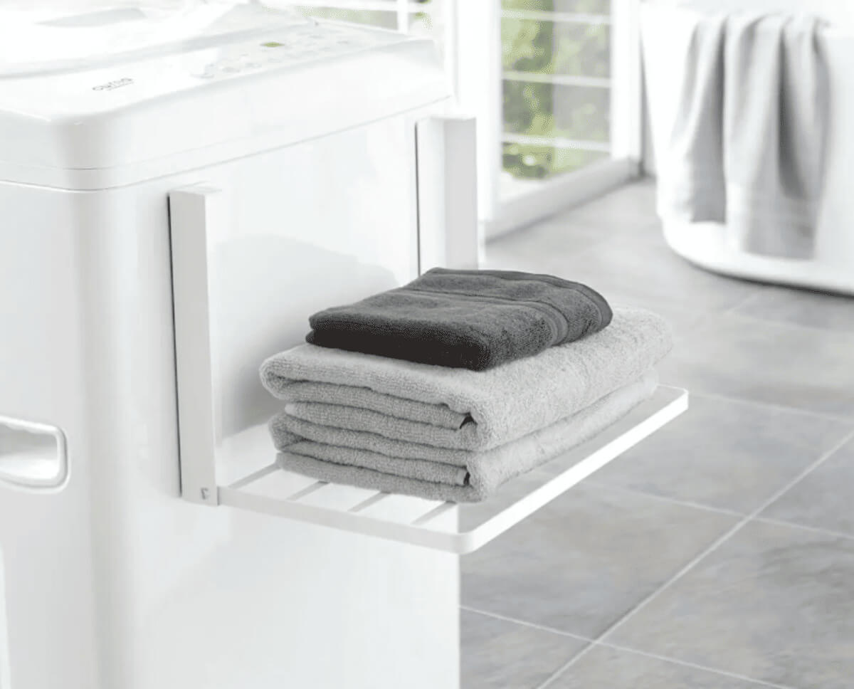 暮らしの質を高めてくれるシンプルなアイテムが豊富な「tower(タワー)」シリーズの注目商品「洗濯機横マグネット折り畳み棚 タワー」。